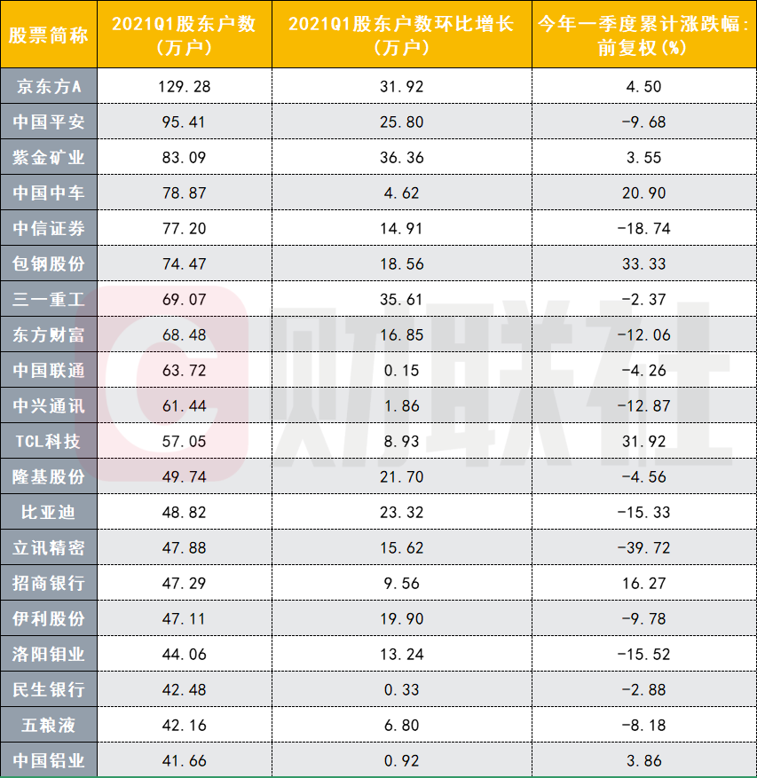 而有些公司的股东户数却在快速增长。据星矿数据统计,截至今年一季度,京东方A以133.0万户的股东户数居首,较2020年末大增31.8万户,季度环比增幅达31.4%。