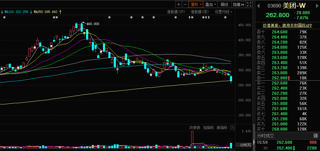 今日早盘,恒生指数冲高回落,而作为一季度基金南下增持的重仓标的,美团-W则直接低开低走,中午收盘前一度跌9.83%,报255.00港币/股,创2020年10月以来的新低。