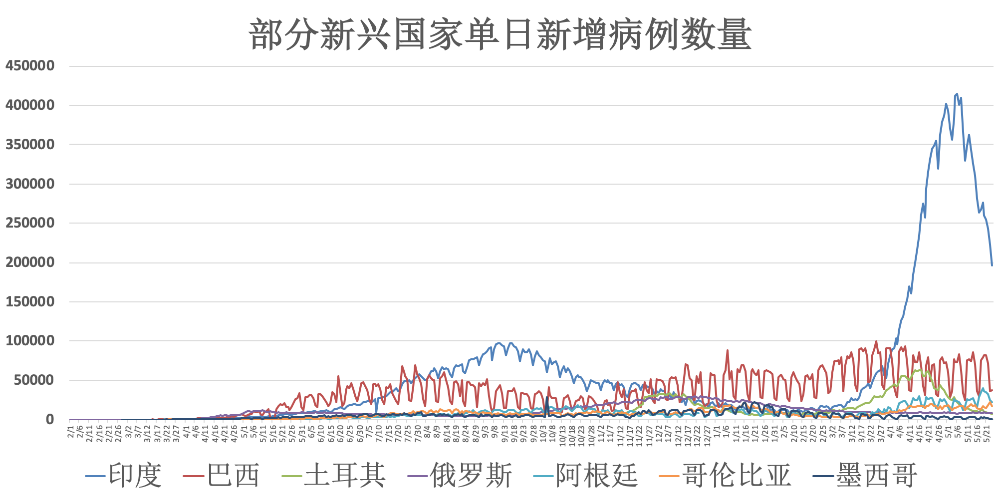 主要新兴市场国家中,印度单日感染人数有所好转,24日新增病例回落至20万例以下,累计确诊病例达26,948,874例,其他国家方面,巴西(16,120,756例)、俄罗斯(4,960,174例)疫情较严重。美洲哥伦比亚(3,249,433例)、阿根廷(3,562,135例)、墨西哥(2,397,307例)确诊人数居前。
