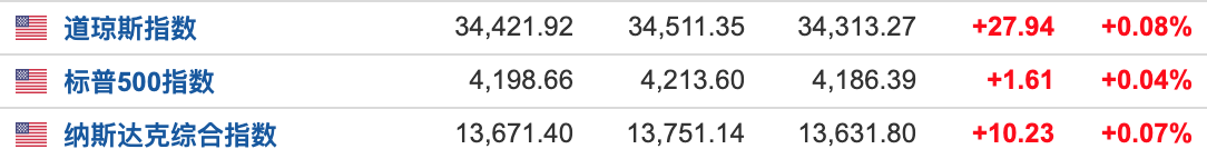 周二美国三大股指维持震荡行情,截至发稿,标普500指数涨0.04%,纳斯达克指数涨0.07%,道琼斯指数涨0.08%。欧洲主要股指多数小幅收涨。
