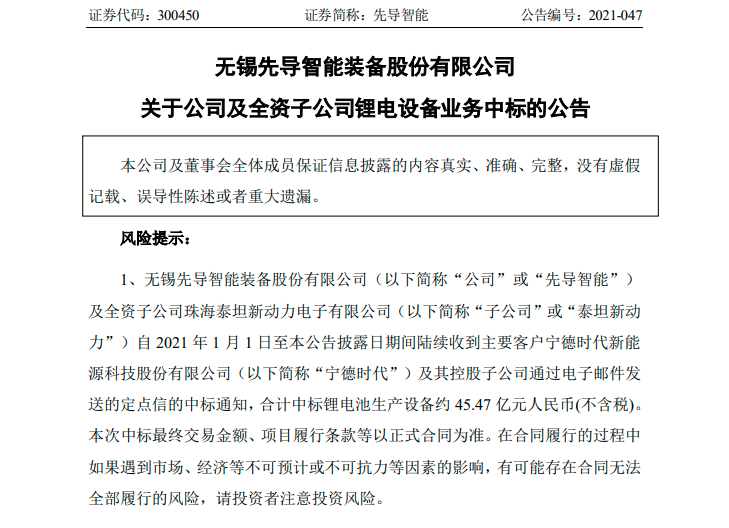 《科创板日报》(上海,研究员 苗淼)讯,5月31日晚间,先导智能公告,今年以来累计中标宁德时代锂电池生产设备约45.47亿元。