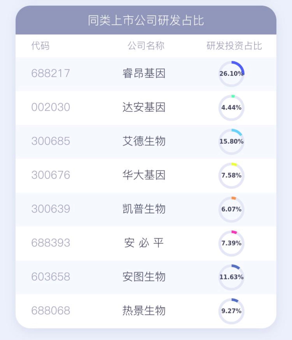 与同类上市公司相比,睿昂基因26.10%的研发投资占比可谓一骑绝尘。