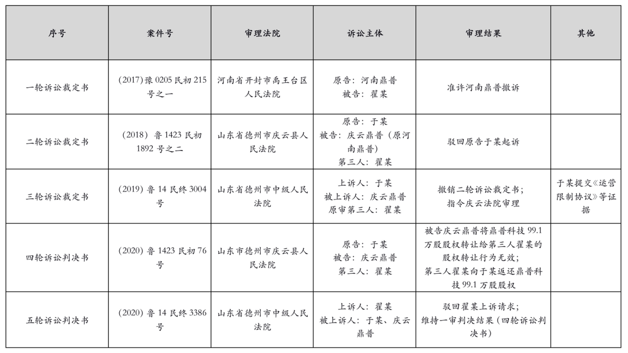 经过多轮诉讼,山东省庆云县人民法院(以下称庆云法院)做出支持于晴起诉请求的判决,判定庆云鼎普信息科技有限公司(以下称庆云鼎普,鼎普科技股东)将鼎普科技99.1万股股权转让给翟蕴鑫的行为无效;翟蕴鑫向于晴返还鼎普科技99.1万股股权。