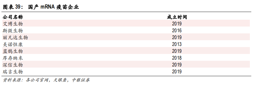 并且大部分公司还是在近几年成立的,国内第一家mRNA制药公司斯微生物为2016年成立,其他公司的成立时间均在2018年以后。(注:美诺恒康虽成立于2013年,但该公司最初创立时主营外包服务,于2018年开始转战研发mRNA肿瘤疫苗)