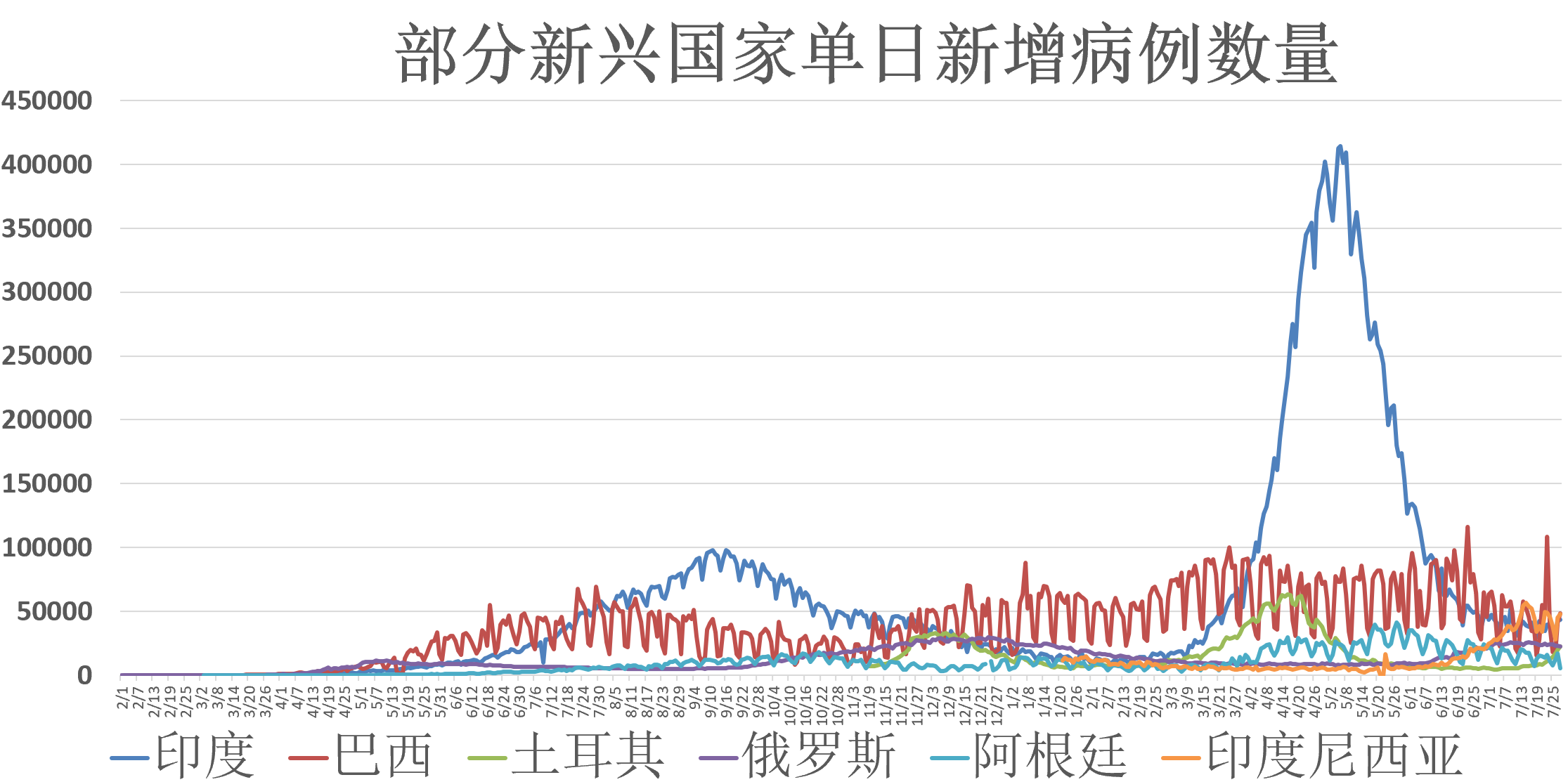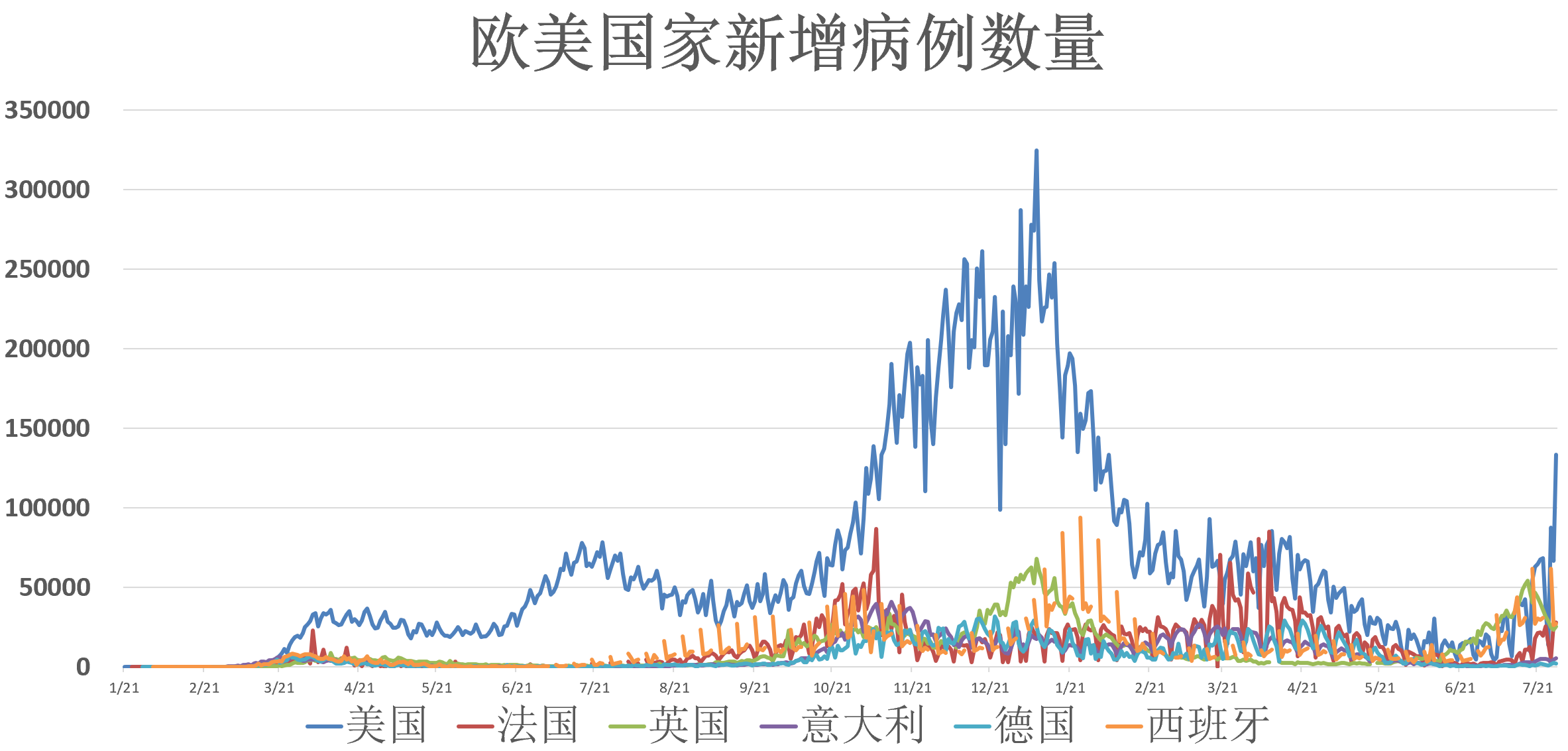 美国(34682785例)受到德尔塔病毒导致的疫情反弹影响,短期内病例出现了显著上升的情况。