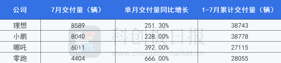 《科创板日报》(上海,研究员 宋子乔)讯,周末,四家造车新势力披露了7月交付数据,理想、小鹏、哪吒均创历史新高,其中理想、小鹏单月交付量超8000辆。