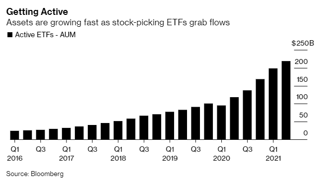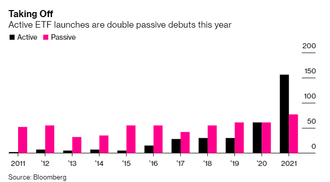 自今年以来,基金公司已向主动型 ETF 投入了 620 亿美元,相当于12%的资金流入仅为4%的资产的市场。目前,基金公司已在2021年推出了156个主动管理产品,而被动基金只有77个。