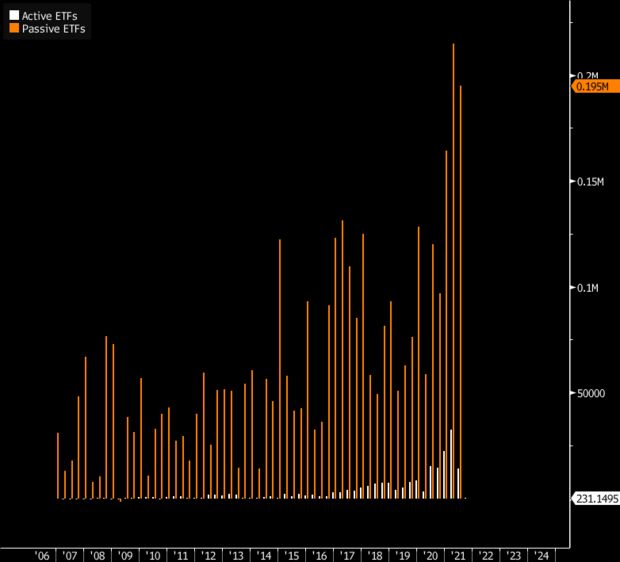 彭博ETF分析师詹姆斯·塞法特表示,在 2020 年末到 2021 年初的重要月份中,很多主动型资金流向了伍德的资金,主动型 ETF 的整体表现比过去要好,但被动型仍占据主导地位。
