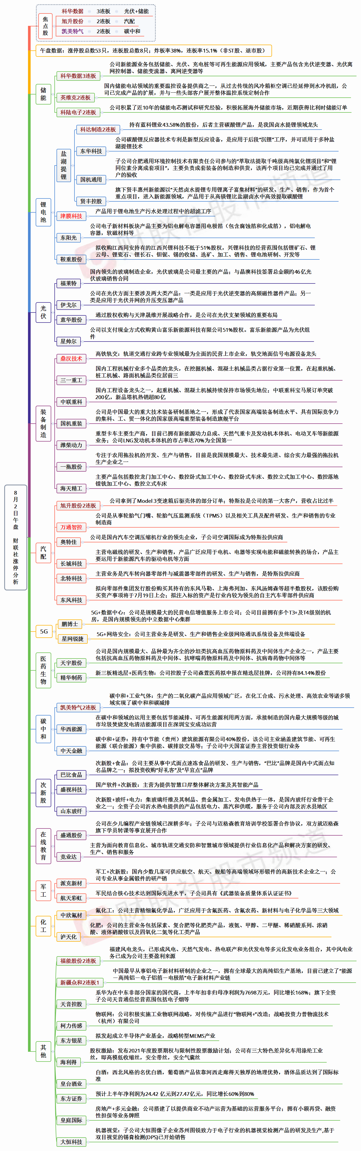 涨幅超9%以上个股105家,其中创业板7家。两市共53股涨停(不包括ST及未开板新股),33股封板未遂,封板率62%,两市共8家连板股,其中逆变器的科华数据3连板,新能源车的旭升股份2连板,金属铝的新疆众和2连板,锂矿的科达制造2连板,风电的福能股份2连板,储能的英维克2连板,碳中和的凯美特气2连板,储能的科陆电子2连板。