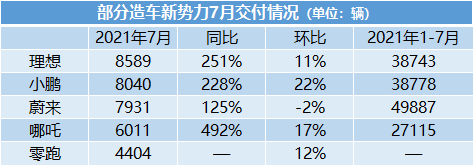 对蔚来汽车双双形成反超的是理想和小鹏。凭借一款理想ONE,理想汽车7月完成交付8589辆,同比增长251.3%,环比增长11.4%;1-7月,理想汽车累计交付量达38743辆。而“多点放量”的小鹏汽车,7月交付量为8040辆,环比增长22%;1-7月,累计交付量为38778辆,是去年全年交付量的1.4倍。
