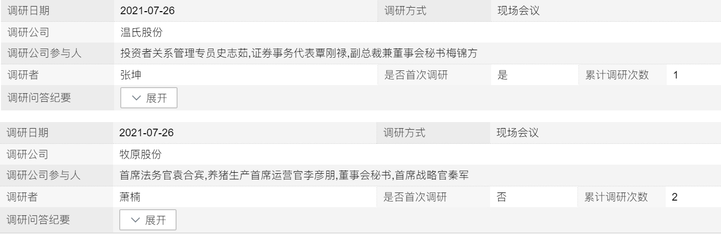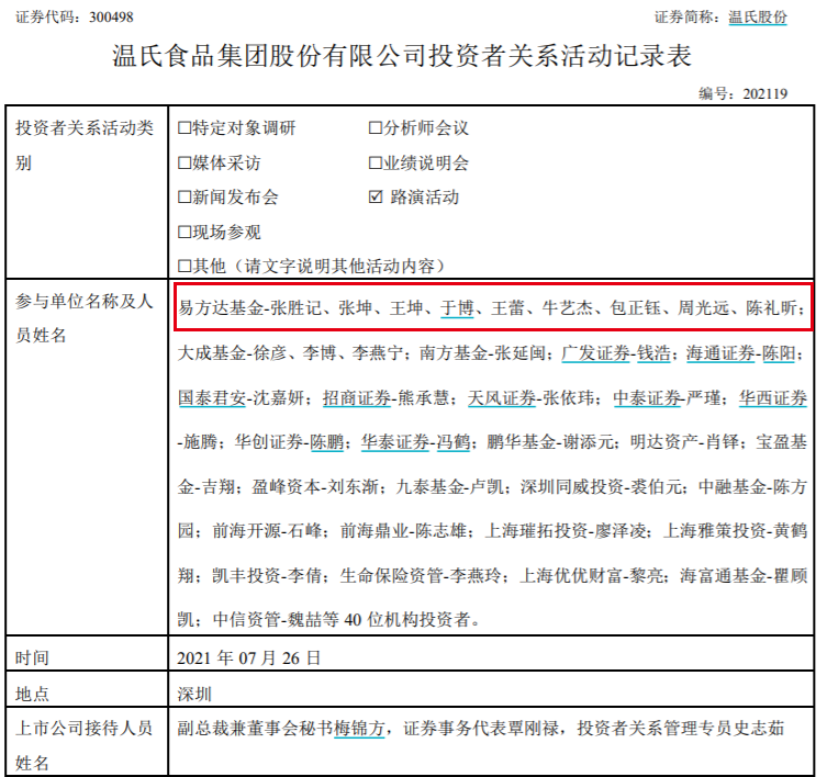 温氏股份7月26日发布的投资关系活动公告显示,易方达系基金经理多人出席:以张坤领衔,还有张胜记(易方达上证50指数增强、易方达沪深300精选指数增强基金经理,二季度末管理规模282.96亿元)、王坤、于博(上述两人均为私募资管计划投资经理)、陈礼昕(养老金基金易方达泰兴基金经理)等人在列。