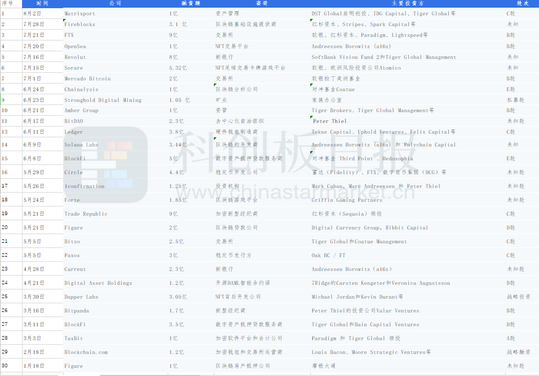 这是区块链行业今年产生的第30起上亿美元融资项目。今年7月21日,行业更是诞生了迄今为止最大规模的融资——加密货币交易所FTX宣布完成9亿美元的B轮融资。而2020年,全行业只有5起上亿美元的融资项目。