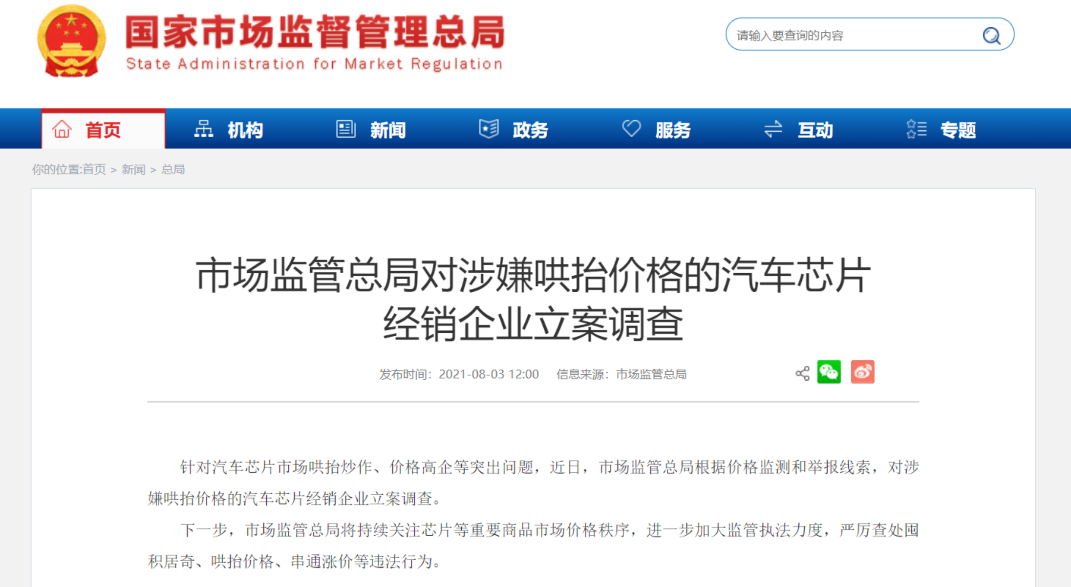 《科创板日报》(上海,记者 曾乐)讯,8月3日,《科创板日报》记者从国家市场监督管理总局方面获悉,针对汽车芯片市场哄抬炒作、价格高企等突出问题,近日,市场监管总局根据价格监测和举报线索,对涉嫌哄抬价格的汽车芯片经销企业立案调查。