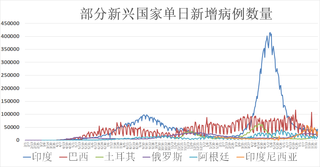 主要新兴市场国家中,印度单日新增病例已趋于稳定,累计确诊病例达31,769,132例,其他国家方面,巴西(19,985,817例)、俄罗斯(6,274,006例)、土耳其(5,795,665例)、阿根廷(4,961,880例)、印度尼西亚(3,532,567例)疫情较严重。