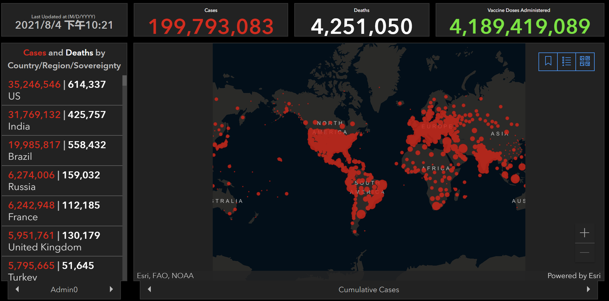 截至北京时间8月4日23时59分,全球新冠肺炎确诊病例上升至199,793,083例,其中死亡病例达到4,251,050例。
