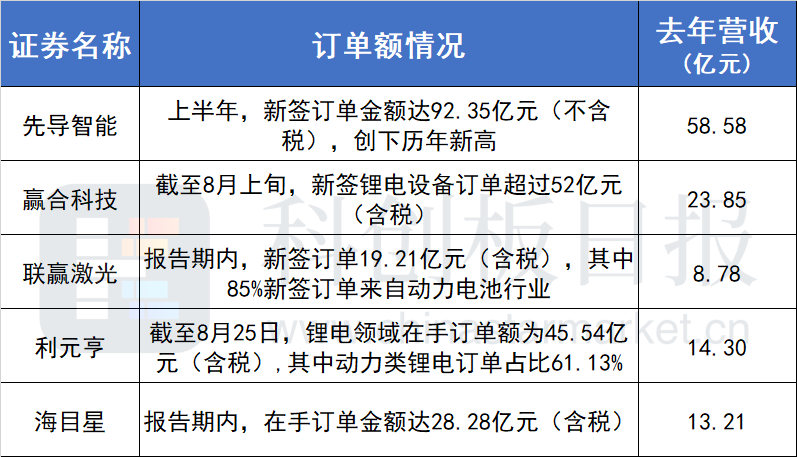 下游锂电企业大手笔扩产,需求快速放量,最直接的反应便是设备厂商的订单金额变化。9家设备商中,有5家在中报明确透露了在手/新增订单额。