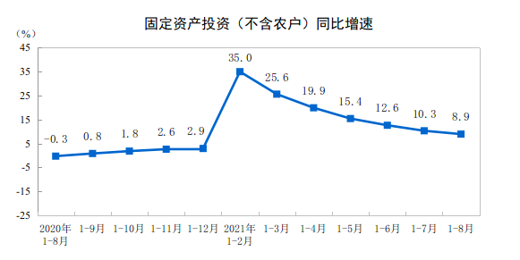 统计局称,1—8月份,全国固定资产投资(不含农户)346,913亿元,同比增长8.9%;比2019年1—8月份增长8.2%,两年平均增长4.0%。其中民间固定资产投资198,559亿元,同比增长11.5%。从环比看,8月份固定资产投资(不含农户)增长0.16%。