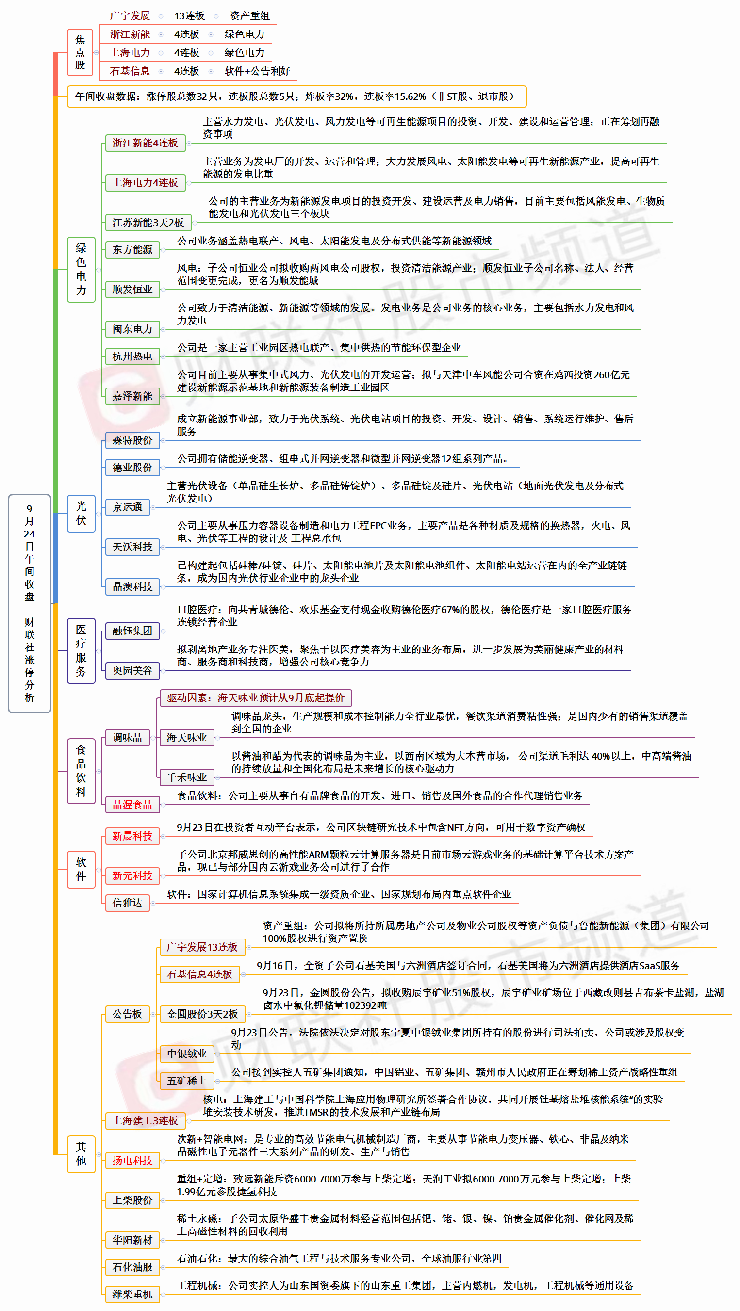 两市共32股涨停(不包括ST及未开板新股),15股封板未遂,封板率68%。两市连板股仅剩5家,其中,资产重组的广宇发展13连板,电力的浙江新能、上海电力晋级4连板,公告利好的石基信息也4连板,核电概念的上海建工录得3连板。