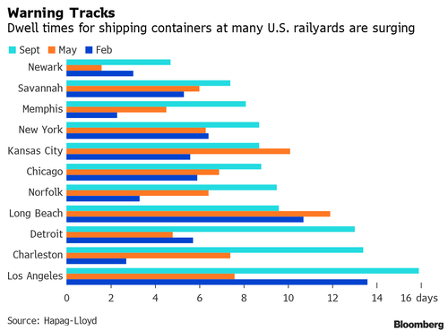目前在陆运方面,根据运输业巨头哈伯劳埃德公司(hapago-lloyd AG)的数据,本月11个美国主要铁路码头的集装箱平均停留时间为9.8天,远高于5月份的6.7天和2月份的5.9天。洛杉矶港口的等待时间是其中最高的,查尔斯顿和底特律的班列延误也在增加。哈伯劳埃德表示,洛杉矶和长滩港口的延误情况最为严重,并预计将在今年余下时间里持续。