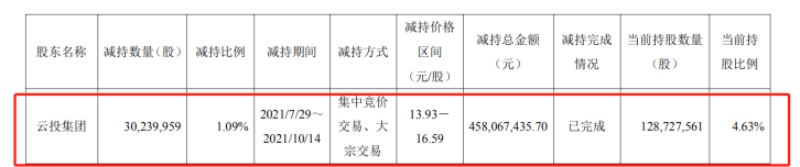 公告信息显示,云投集团通过集中竞价交易方式减持股份价格区间为14.50-16.59元/股,减持金额约4.23亿元;通过大宗交易方式累计减持股份价格区间为13.93-14.67元/股,减持金额为3476.68万元;两种方式共减持金额达4.58亿元。
