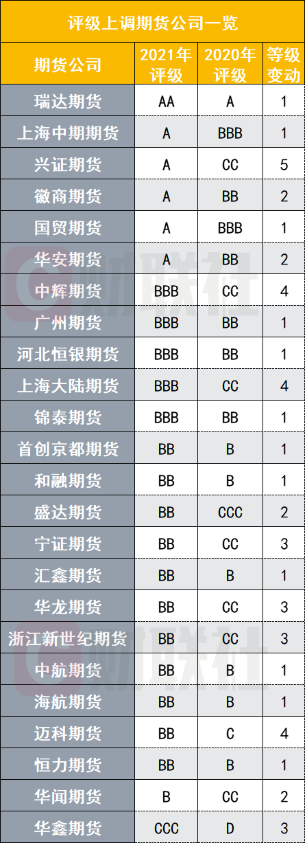 具体来看,迈科期货从去年的C级上调至今年的BB级,中辉期货从去年的CC级上调至今年的BBB级,上海大陆期货从去年的CC级升至今年的BBB级。