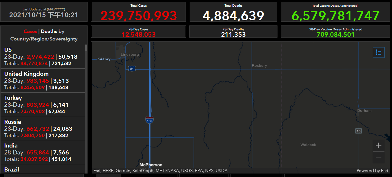 财联社(上海,编辑 史正丞)讯,截至北京时间10月15日23点50分,全球新冠肺炎确诊病例上升至239,750,993例,其中死亡病例调整为4884639例。