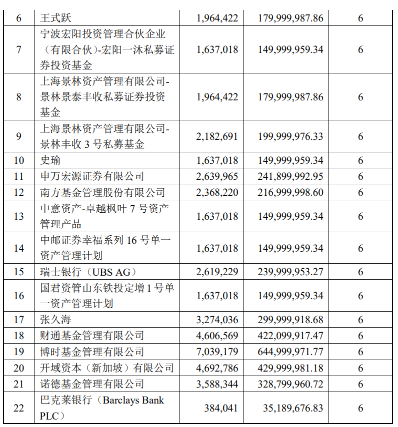 此外,瑞士银行、开域资本(新加坡)有限公司、巴克莱银行3家外资机构也分别以2.4亿元、4.3亿元和3518.97万元的金额参与了此次定增。