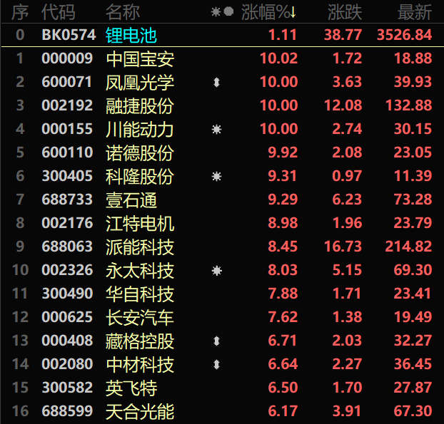 财联社(上海,编辑 梓隆)讯,今日锂电板块再度走强,截止收盘,锂电池概念股中,中国宝安、凤凰光学、融捷股份、川能动力涨停,诺德股份、科隆股份、壹石通涨幅逾9%,盐湖提锂概念股中,三达膜、藏格控股、中铝国际等股涨幅居前。