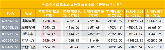 值得注意的是,相比于增持行业板块的多元化,多只社保基金减持股数居前的大多是化工板块个股,截至目前,三季度社保基金减持幅度居前的个股包括旗滨集团、藏格控股、新洋丰、万华化学、贵研铂业,减持股数依次是6392.84万股、1156.66万股、1144.92万股、1088.75万股、72.74万股。