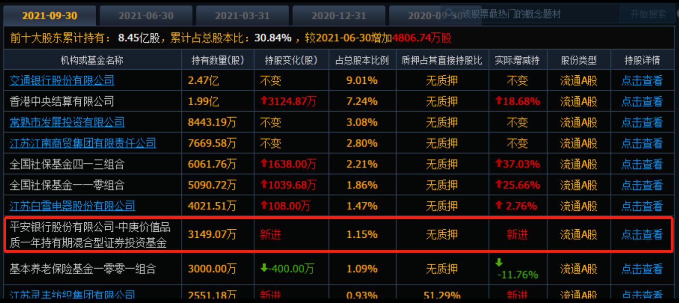 今日,银行板块表现强势,常熟银行涨停。在常熟银行今日披露的三季报中可以看到,中庚价值品质新进常熟银行三季度末前十大流通股东,位列第七。3149.07万股持仓如按9月30日收盘价计,市值2.02亿元,刚好低于基金第十大重仓股兰花科创的2.04亿元,大概率是该基金的第一大“隐形重仓股”。
