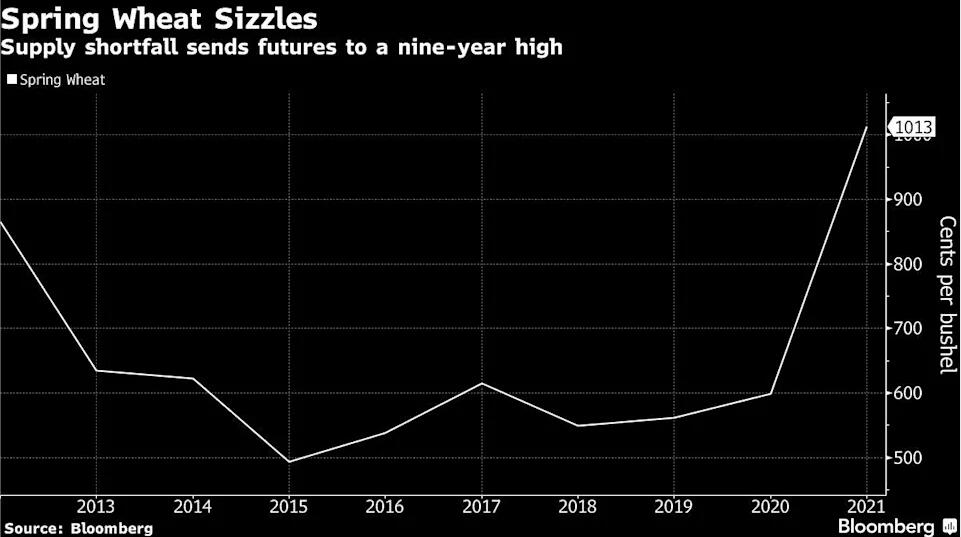 随着极端干旱和炎热天气导致今年美国和加拿大产量受损,本周五芝加哥期货交易所的美国春小麦期货价格自2012年以来首次触及了每蒲式耳10美元。春小麦通常被用来制作披萨面团和百吉饼(硬面包圈)。