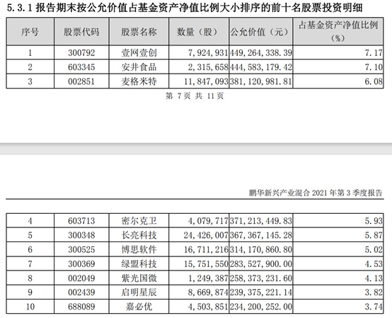 鹏华新兴产业2021年三季度末前十大重仓股