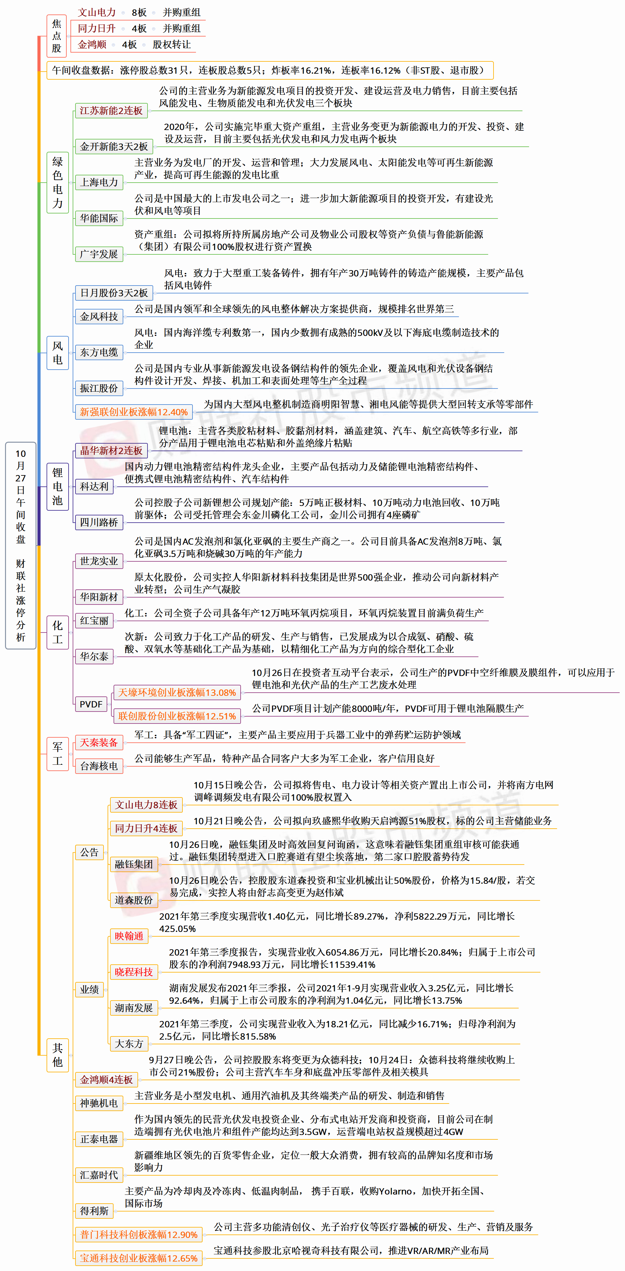 两市共31股涨停(不包括ST及未开板新股),6股封板未遂,封板率83.78%。两市连板股5家,其中并购重组的文山电力8连板、同力日升和金鸿顺4连板,电力的江苏新能和化工的晶华新材均2连板。