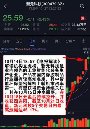 其在10月15日冲高回落,在10月18日开盘后持续拉升,并收获四连阳,截至10月21日收盘,新元科技5个交易日内最高涨幅达45.17%。