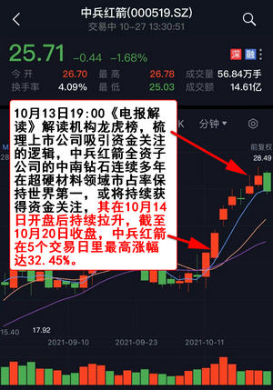 其在10月14日开盘后持续拉升,截至10月20日收盘,中兵红箭在5个交易日里最高涨幅达32.45%。