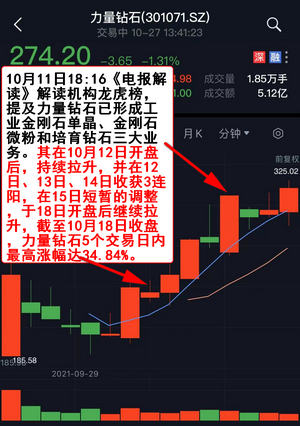 其在10月12日开盘后,持续拉升,并在12日、13日、14日收获3连阳,在15日短暂的调整,于18日开盘后继续拉升,截至10月18日收盘,力量钻石5个交易日内最高涨幅达34.84%。