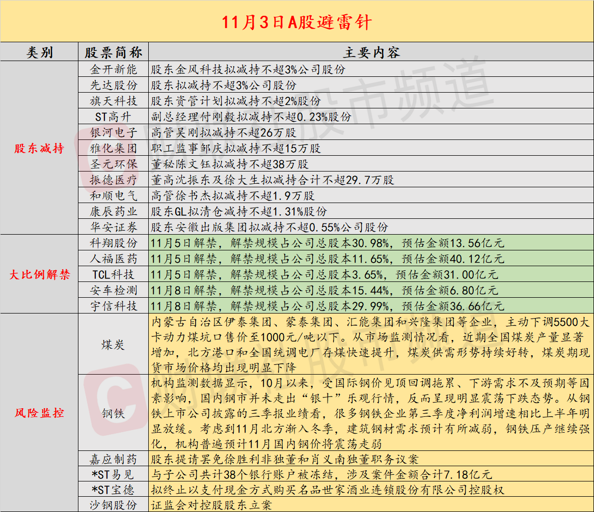 导读:1、内蒙古多家煤炭企业主动下调坑口煤售价至每吨1000元以下;2、证监会对沙钢股份控股股东立案;3、机构预计11月国内钢价将震荡走弱;4、*ST宝德拟终止以支付现金方式购买名品世家酒业连锁股份有限公司控股权;5、10月基金发行遇冷,份额环比缩减近五成;6、美股三大指数小幅收涨,中概股逆势下跌。