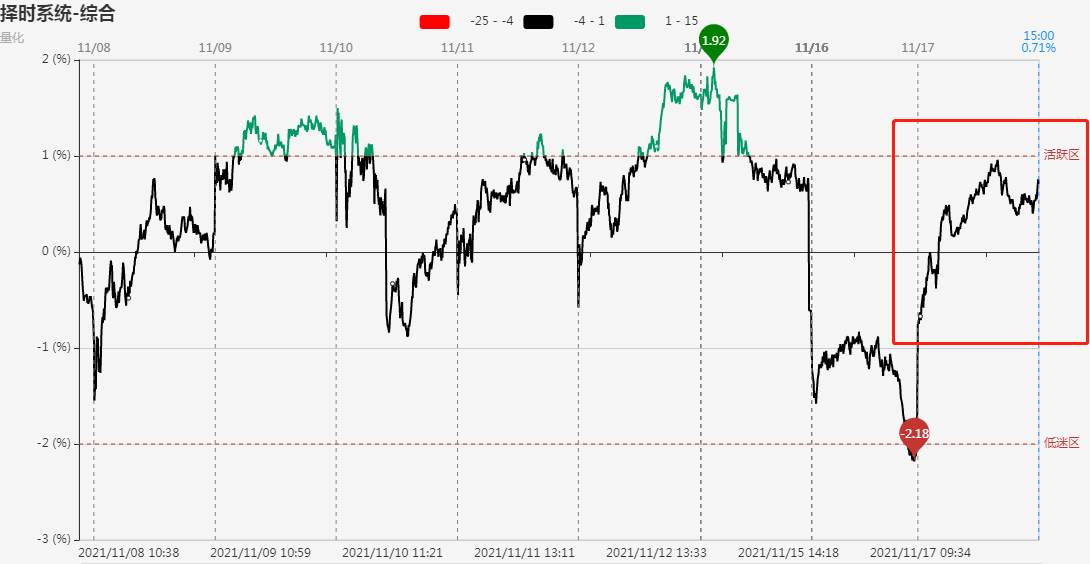 指标显示,市场短线情绪开盘从昨日的低迷区快速回升至0轴附近,盘中震荡冲高一度逼近活跃区。