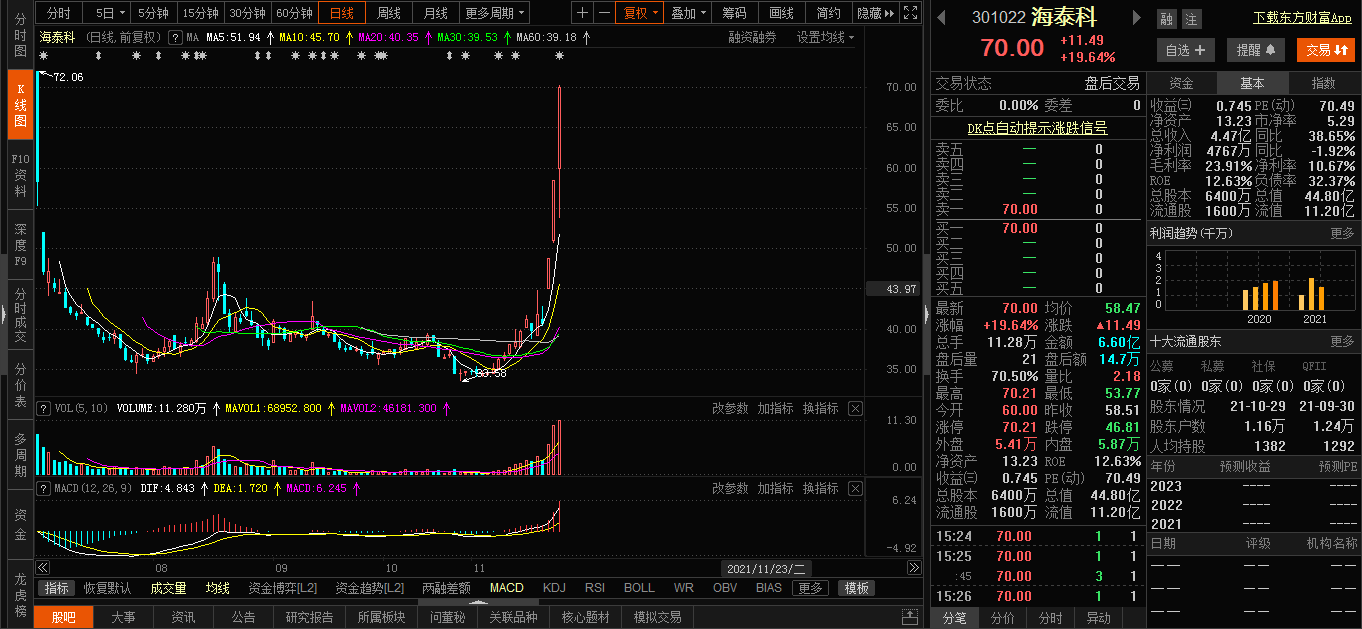 财联社11月23日讯,今日共59股涨停,23股封板未遂,封板率为72%;九安医疗7连板领涨,创业板中文在线2连板,海泰科收涨19.64%。盘面上,收涨个股2396只,收跌个股1945只,NFT、电子烟、培育钻石等涨幅居前,农业、养殖业、天然气等跌幅居前。
