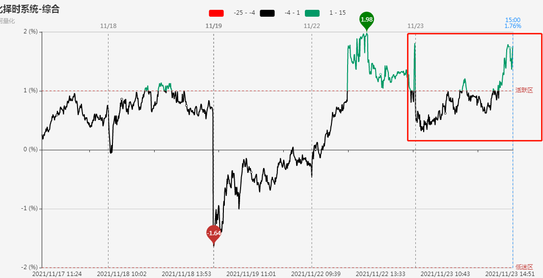 指标显示,市场短线情绪今日盘中主要在活跃区附近震荡,尾盘随着海泰科、中青宝等高位人气股的拉升大幅走高。