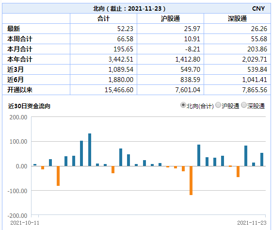 北向资金,今日合计净买入52.23亿元。其中,沪市净买入25.97亿元,深市净买入26.26亿元。