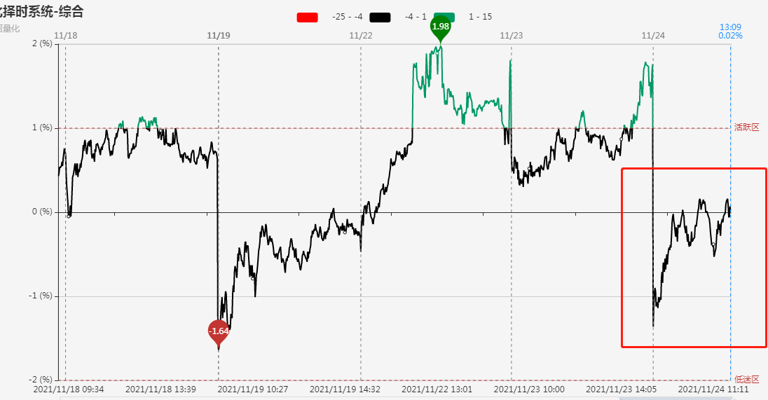指标显示,市场短线情绪竞价从昨日的活跃区上方回落至0轴下方,早盘回升至0轴附近后进入窄幅振荡状态。