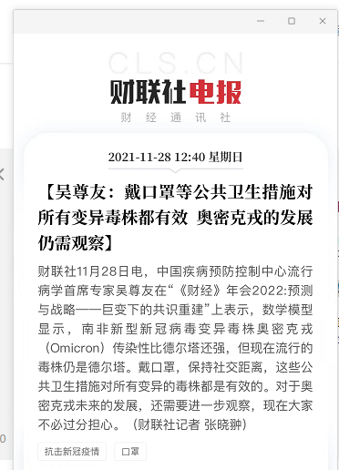 中国疾病预防控制中心流行病学首席专家吴尊友周日表示,数学模型显示,南非新型新冠病毒变异毒株奥密克戎(Omicron)传染性比德尔塔还强,但现在流行的毒株仍是德尔塔。戴口罩,保持社交距离,这些公共卫生措施对所有变异的毒株都是有效的。对于奥密克戎未来的发展,还需要进一步观察,现在大家不必过分担心。