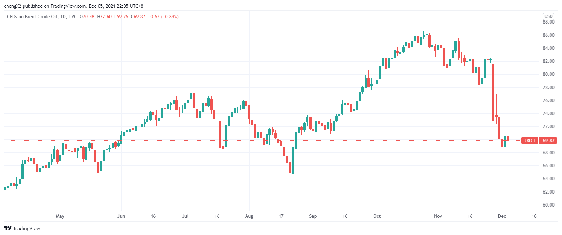 从11月开始布油跌幅已经达到15%,包括发现奥密克戎病毒、OPEC+增产和美国等进口国释放储备试图降低国内通胀压力等因素,合力将布油打到70美元下方。沙特阿美CEO Amin Nasser此前接受采访时也表示,他个人对于需求非常乐观,市场对于奥密克戎的反应有些过头了。