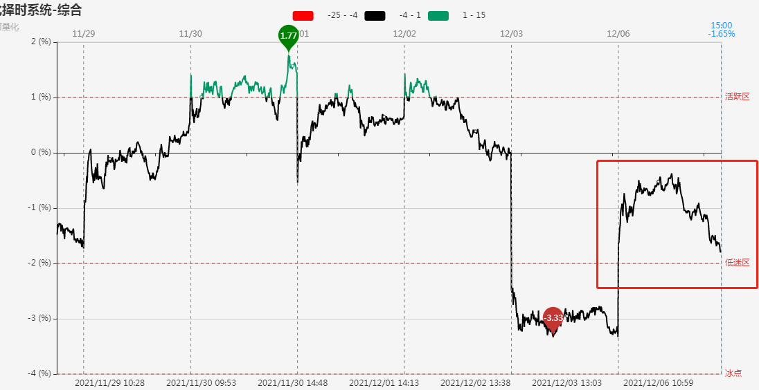 指标显示,市场短线情绪开盘较上周五会有回升,早盘主要在0轴下方震荡,午后与指数同步回落,收盘在低迷区上方。