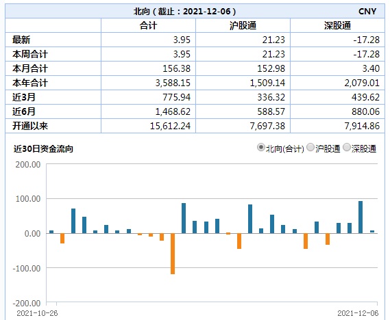 北向资金,今日合计净买入3.95亿元。其中,沪市净买入21.23亿元,深市净卖出17.28亿元。