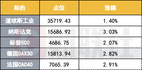 美国股市周二大幅上扬,截至收盘,道琼斯指数涨1.40%,报35719.43点;标普500指数涨2.07%,报4685.75点;纳斯达克指数涨3.03%,报15686.92点。大型科技股全线上涨,热门中概股普涨。
