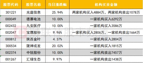 今日龙虎榜机构以净买入居多,其中多只高位股获机构买入,九安医疗、宝鹰股份、陕西金叶、陇神戎发等高位连板股均获机构高位抢筹,由此来看短期高位股的行情或仍难结束,不过参与风险也在逐步加大。