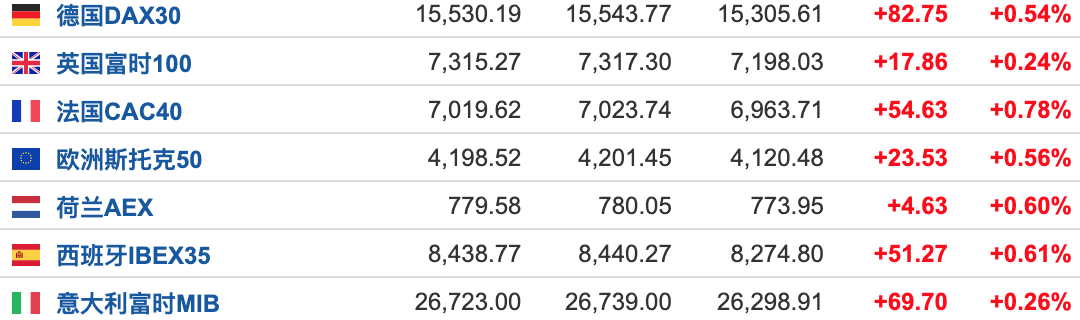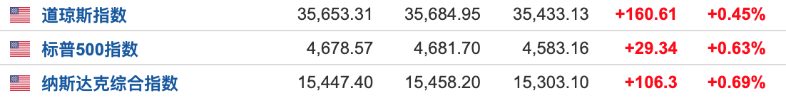 正在交易中的美国三大股指悉数走高,截至发稿,标普500指数涨0.63%,纳斯达克指数涨0.69%,道琼斯指数涨0.45%。欧洲主要股指集体上扬。