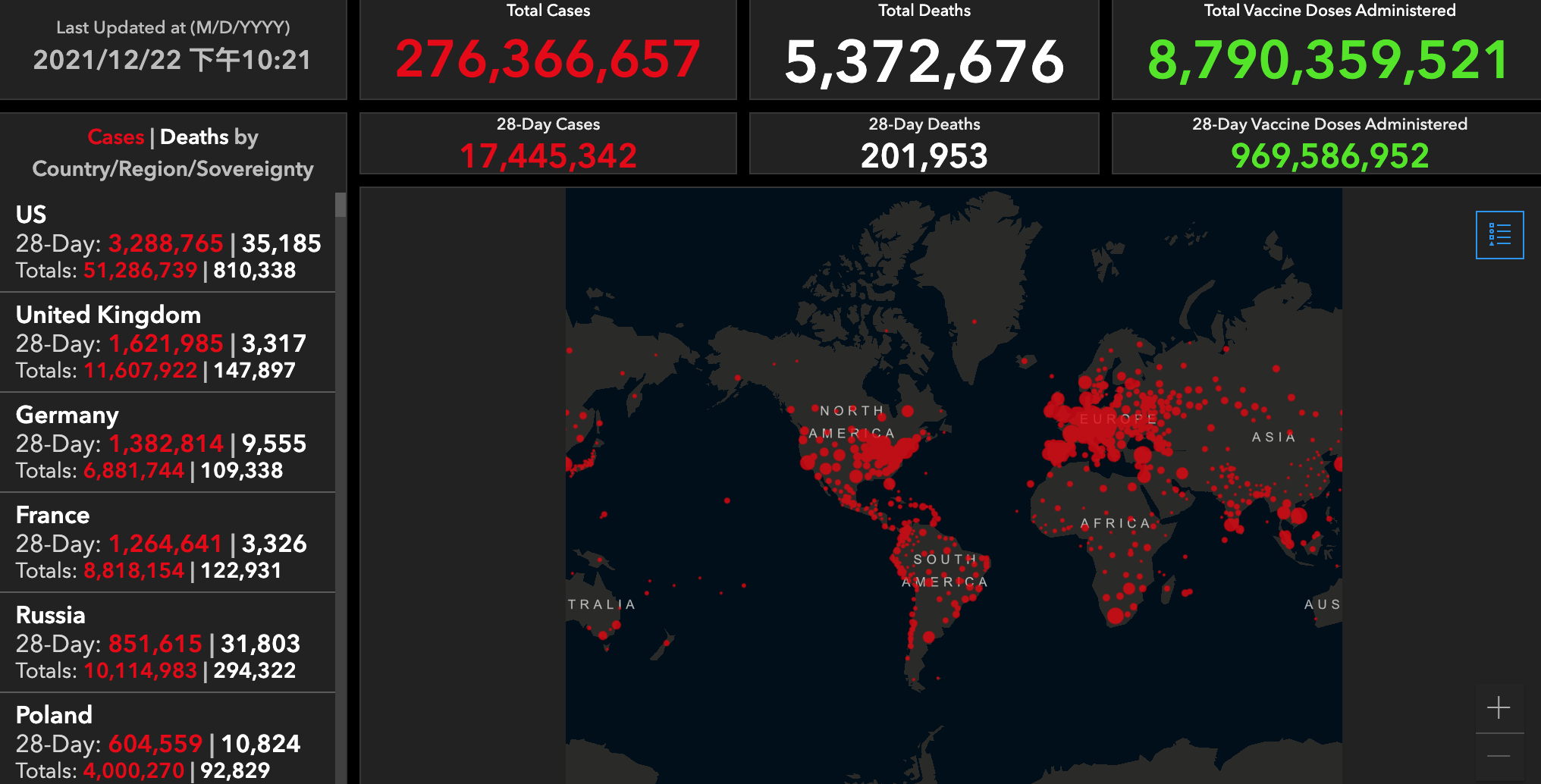 财联社(上海,编辑 夏军雄)讯,美国约翰斯·霍普金斯大学发布的统计数据显示,截至北京时间12月22日23时59分,全球新冠肺炎确诊病例上升至276,366,657例,其中死亡病例达到5,372,676例。